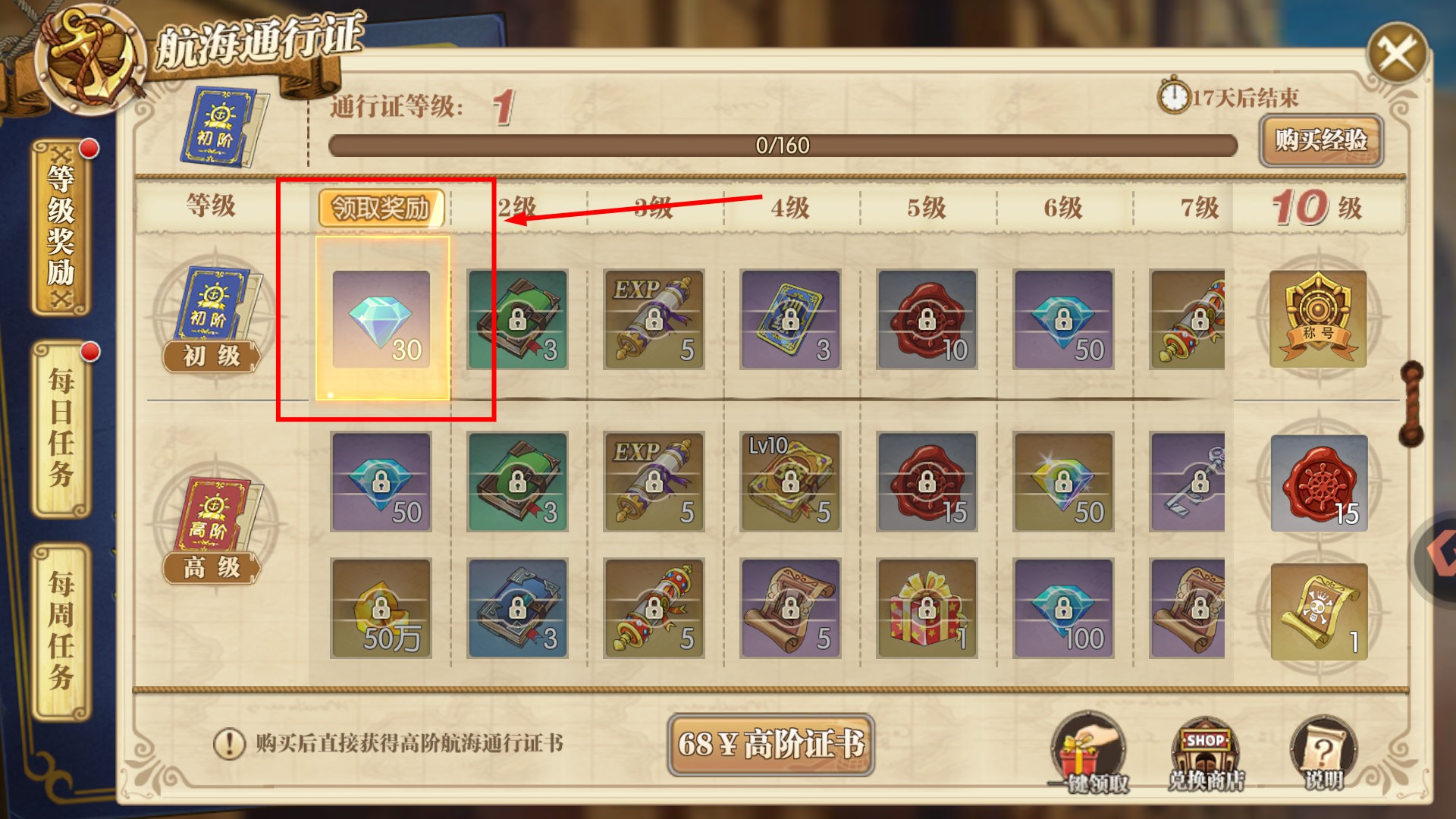 2、在通行证的【等级奖励】页面,点击【领取奖励】按钮,可获取【钻石】30,积累通行证经验。