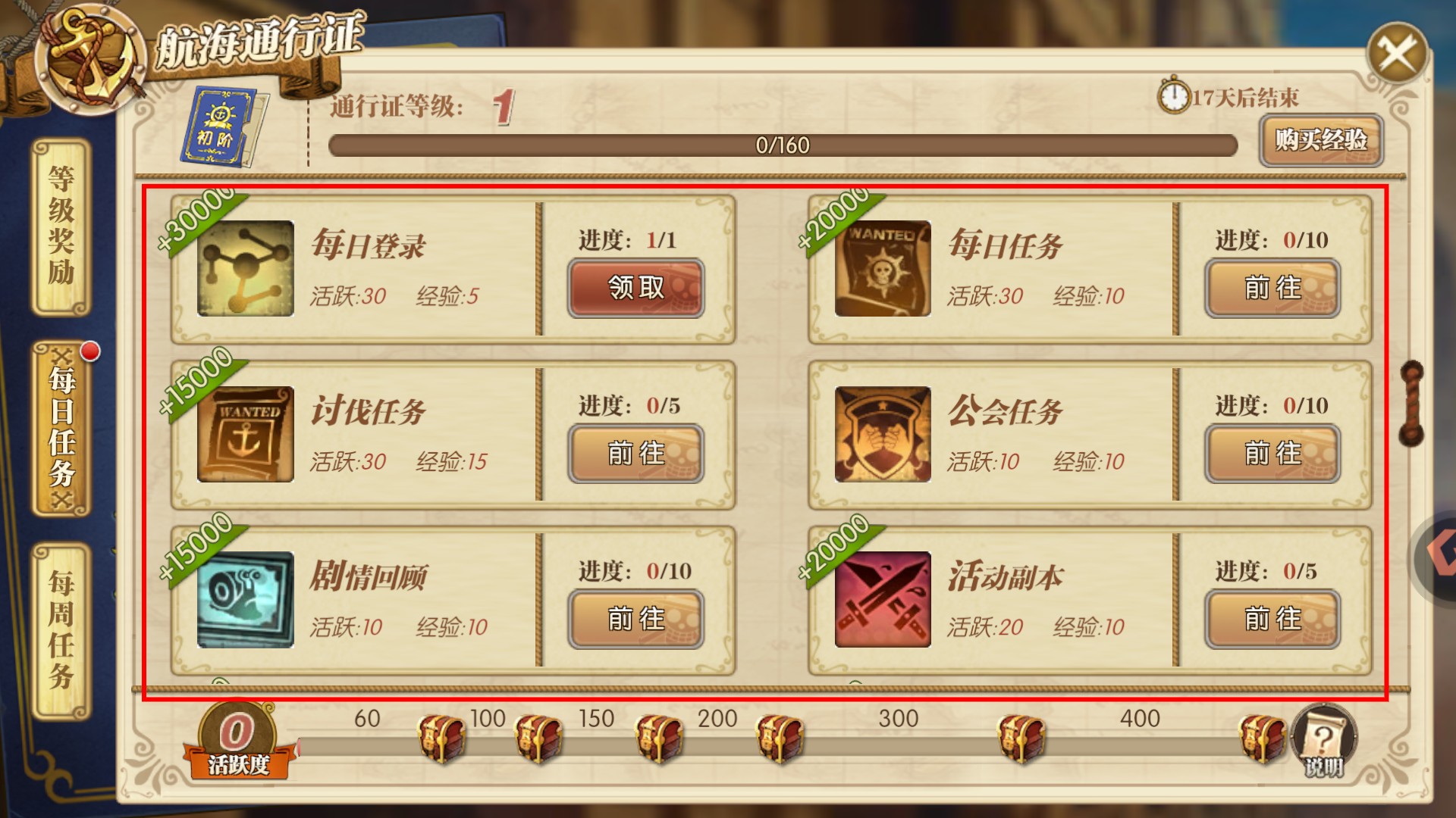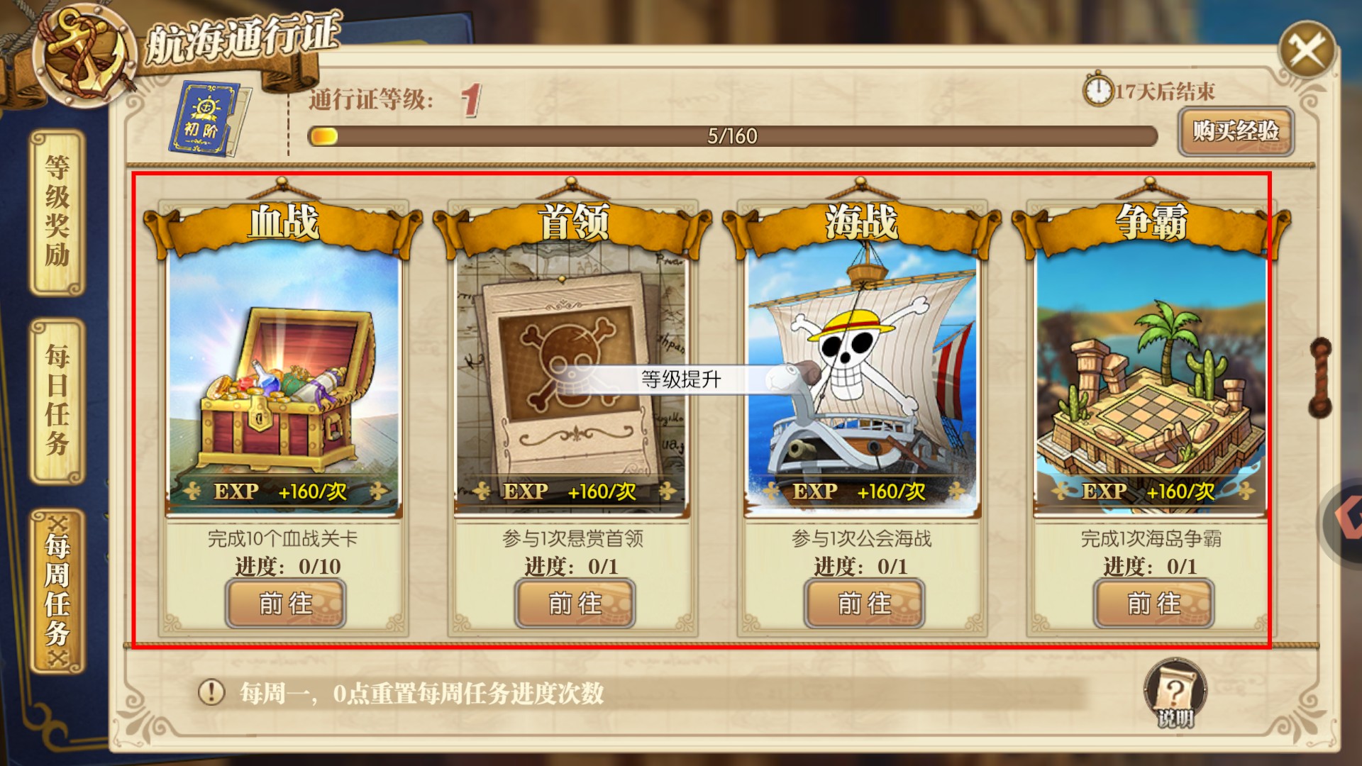 4、参与【血战】【首领】等每周任务,点击【前往】完成任务,获取经验提升通行证等级。