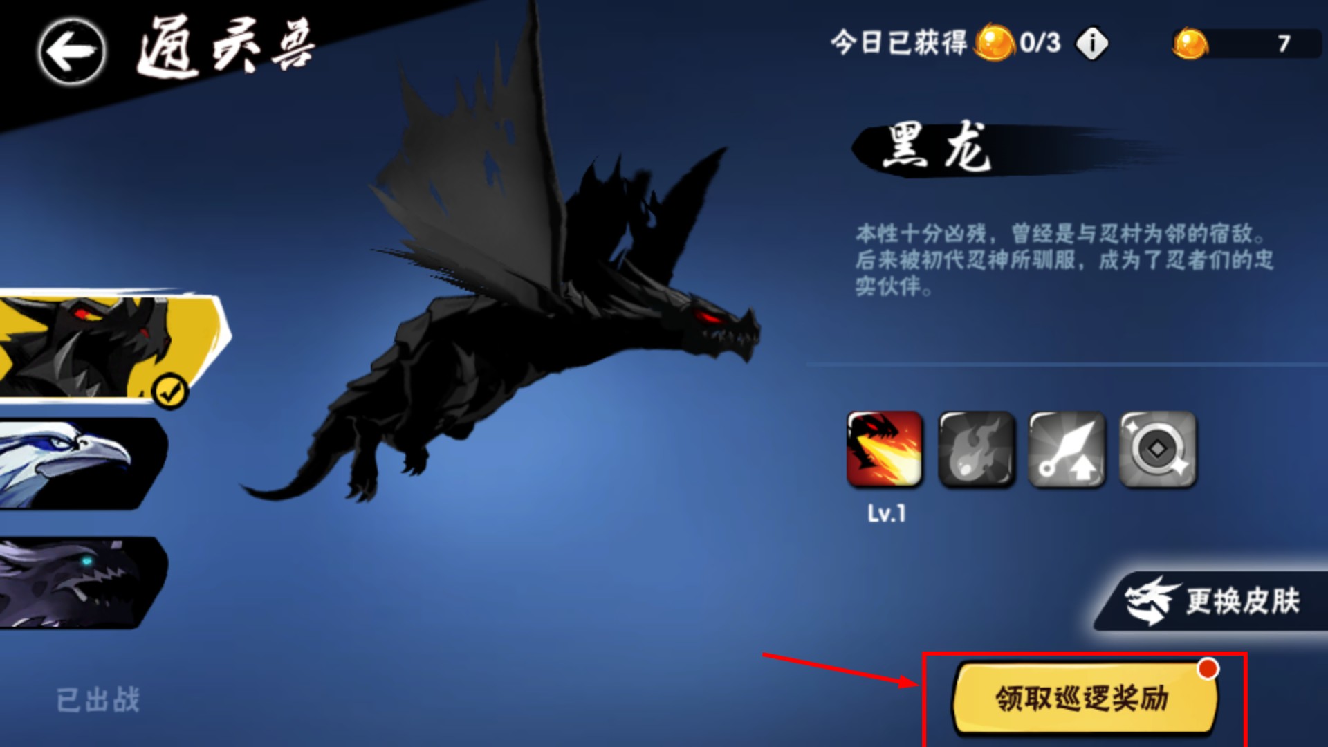 2、在通灵兽界面,点击黄色的【领取巡逻奖励】按钮,获取今日巡逻对应的奖励,提升游戏内资源储备。