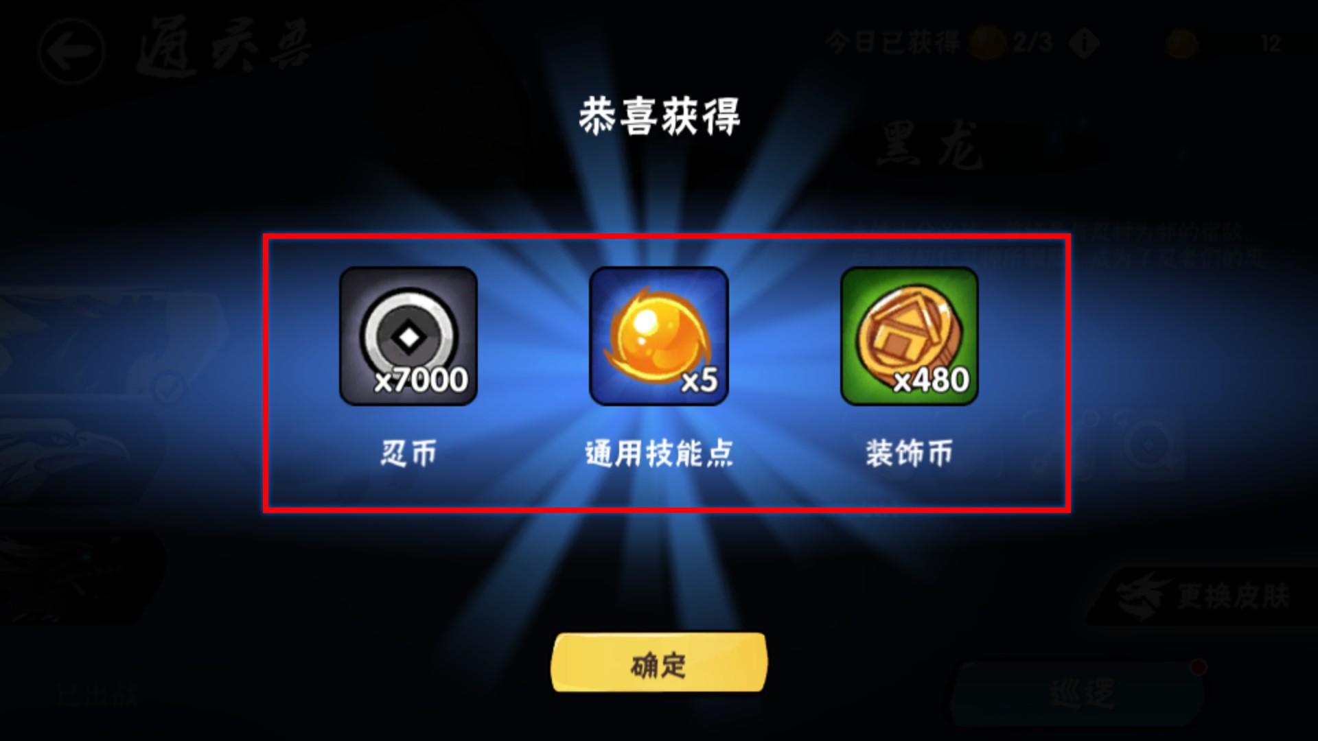 3、领取巡逻奖励后,可获得【忍币】-【通用技能点】-【装饰币】等道具,用于角色和通灵兽的培养升级。