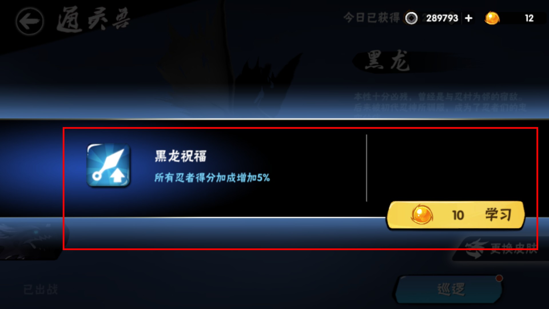 4、消耗【10】个对应道具点击【学习】按钮,激活【黑龙祝福】,为所有忍者增加5%的得分加成效果。