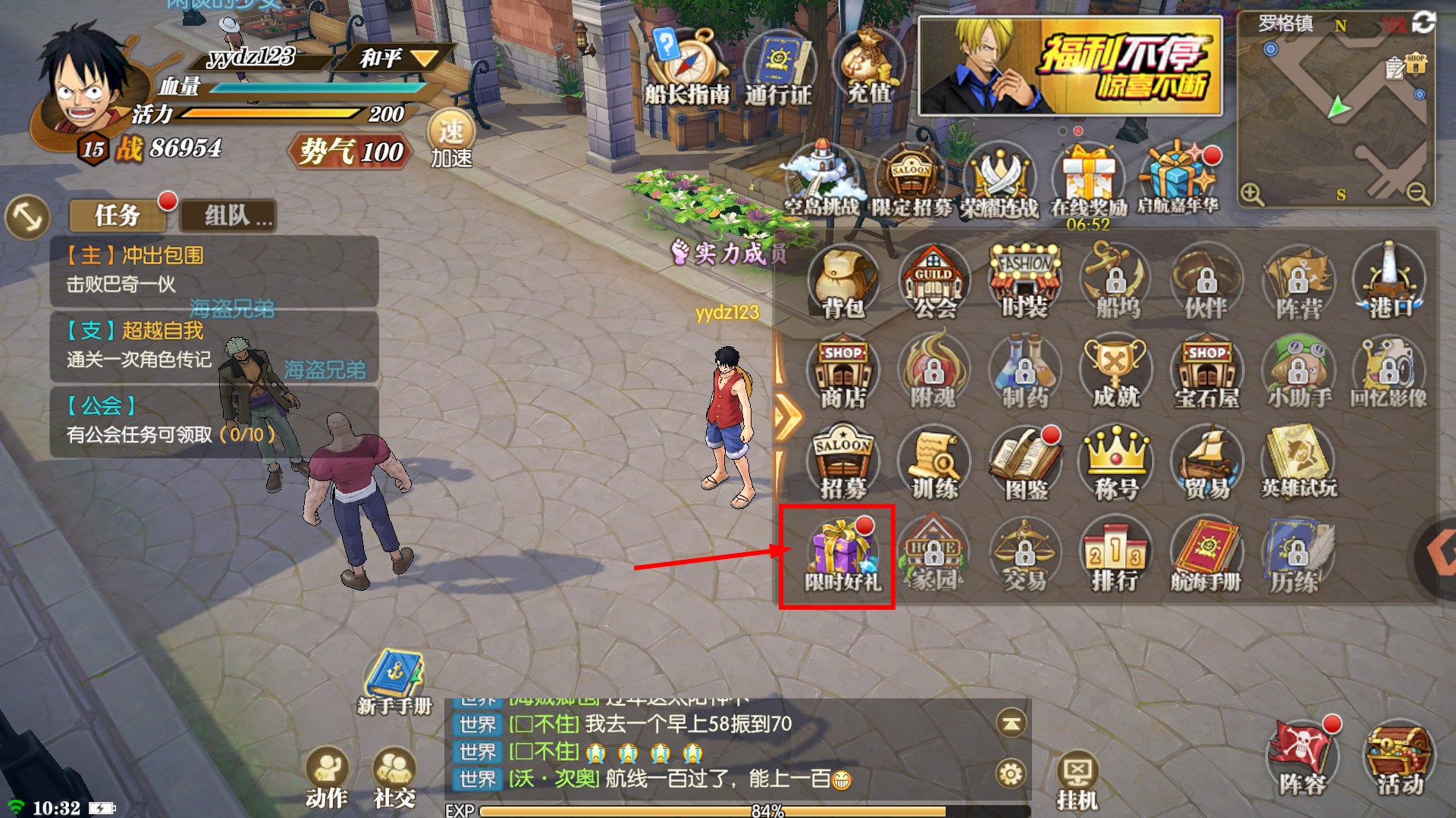 1、游戏主界面右侧有【限时好礼】,点击进入可领取限时福利,助力积累初期资源,快速推进主线任务进度。