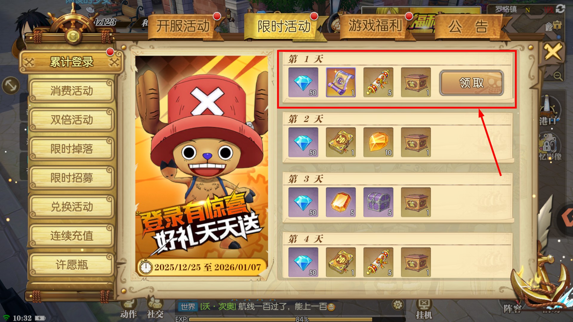 2、累计登录活动第一天可领取【钻石-50】【卷轴-1】等奖励,每日登录领取资源,为后续养成角色奠定基础。