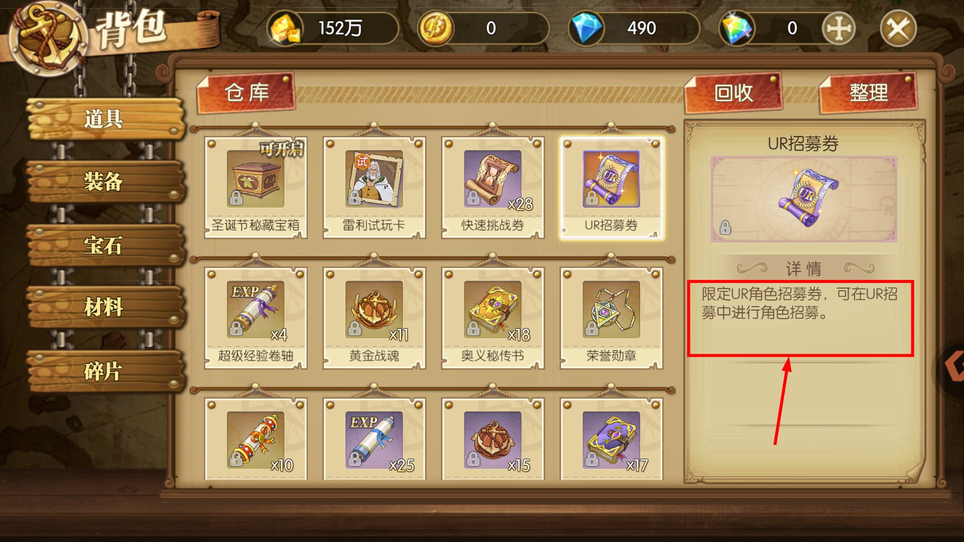 3、背包中的【UR招募券】可用于招募强力角色,合理使用可快速组建强力队伍,提升冒险战斗力。