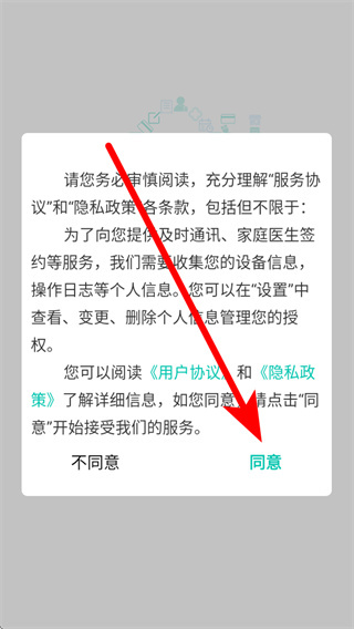 1、打开居民健康后,弹出弹窗,点击同意,进入应用主界面。